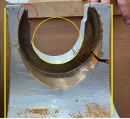 Comme on peut le constater, la zone en U a subi une flexion importante des deux côtés, ce qui a provoqué la rupture totale du support à droite, et la rupture partielle du siège de la butée.